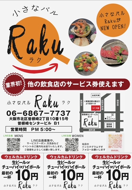 【小さなバルRaku】開店のお知らせ 投稿日: 2023年4月20日2026年4月14日 投稿者: rakuhachi 日頃より楽八をご愛顧いただき誠にありがとうございます。 この度、「小さなバルRaku」を開店することになりました。 お近くにお越しの際は是非お立ち寄りくださいますようどうぞ宜しくお願い申し上げます。 「小さなバルRaku」 ■所在地: 大阪市北区曽根崎2丁目10番15号曽根崎センタービルB1 ■オープン日: 2023年4月22日 PM5:00~ ■営業時間: PM5:00~
